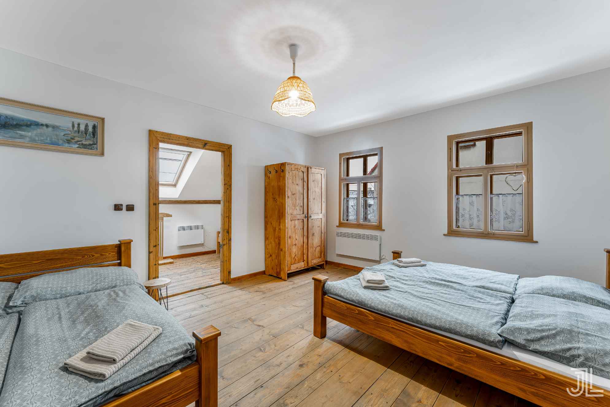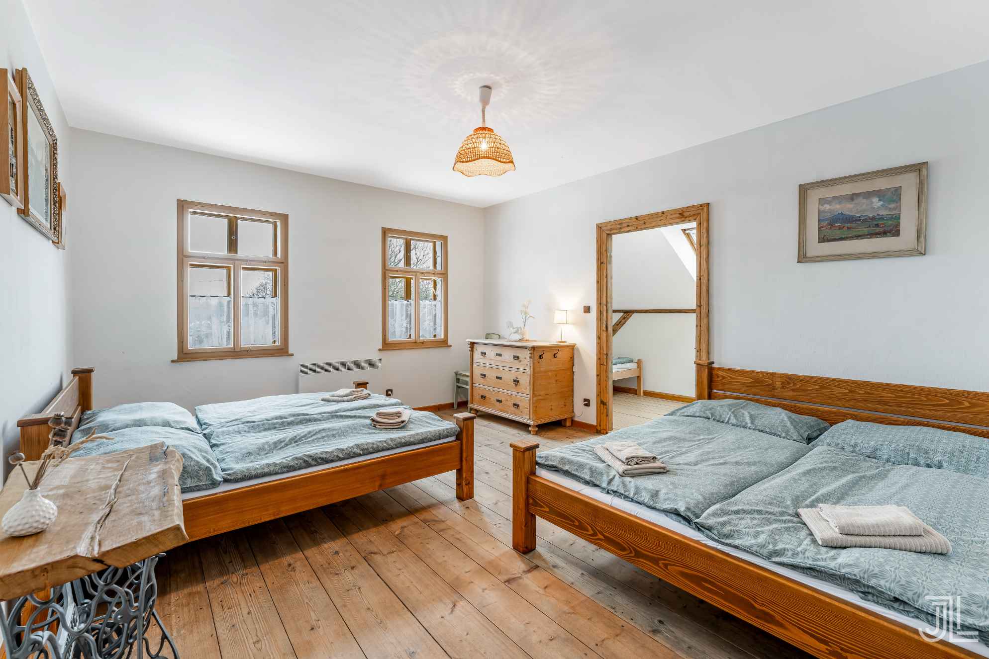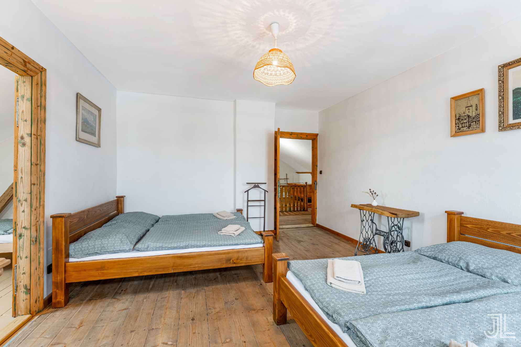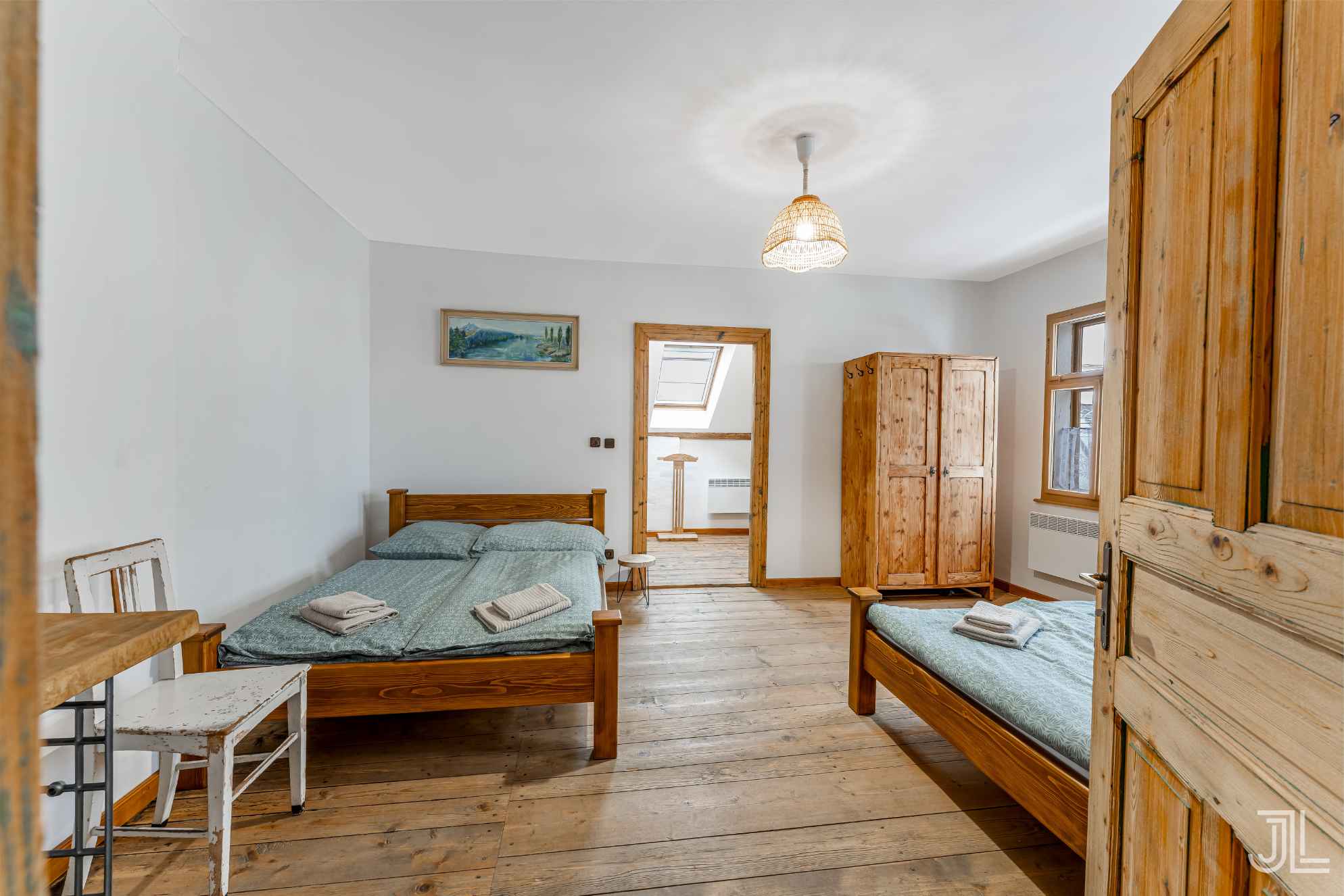 V patře pak najdete prostorný pokoj se dvěma dvoulůžkovými postelemi, masivním dřevem a vstupem do menšího navazujícího pokoje. Ideální hlavní ložnice v patře.