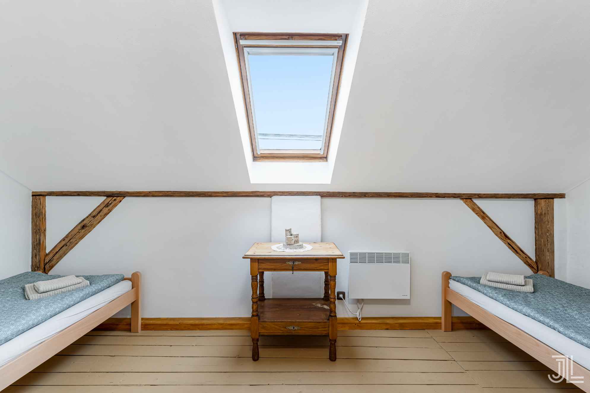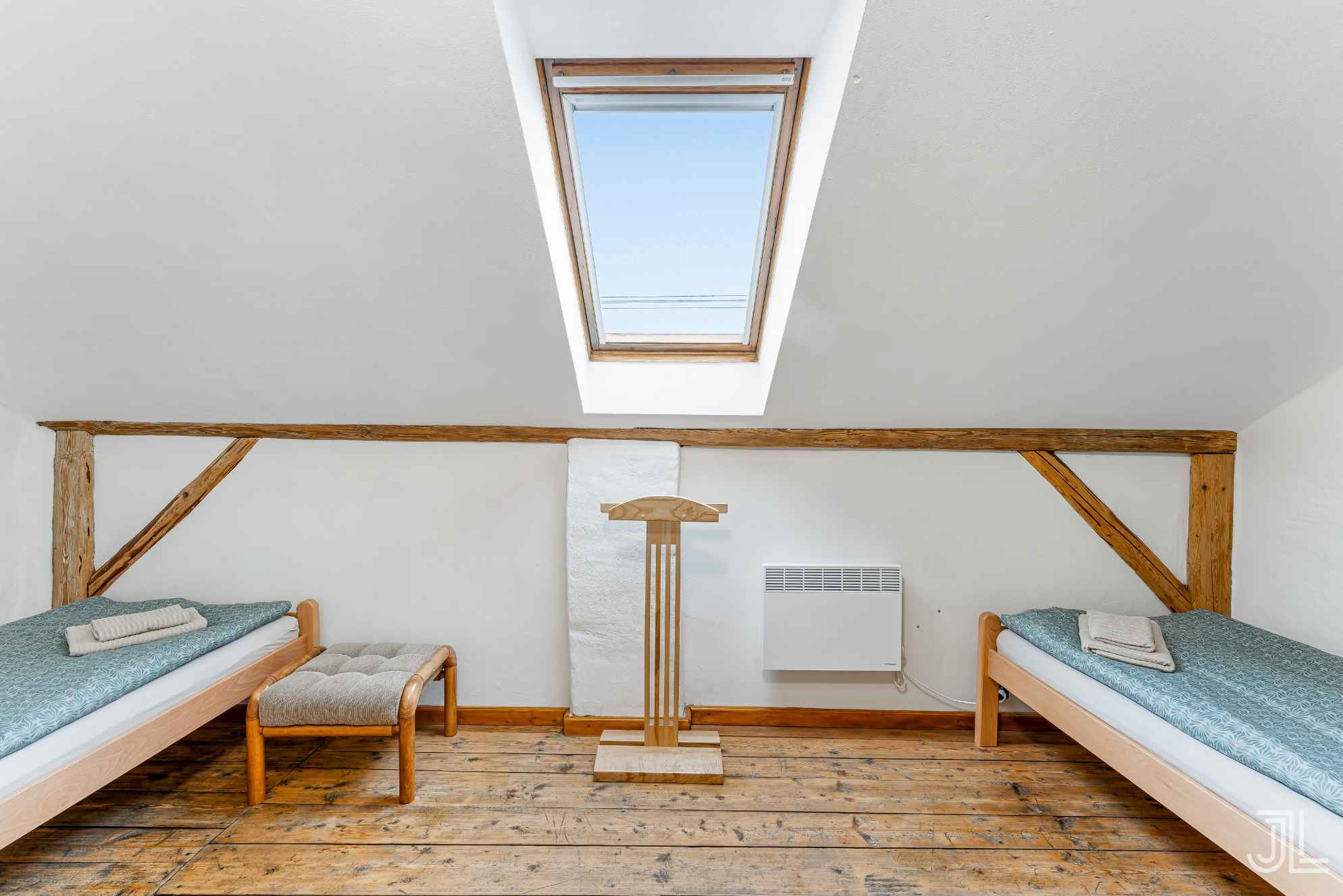 Podkrovní dvoulůžkové pokoje se dvěma samostatnými postelemi a střešním oknem, které přivádí dostatek světla do prostoru.