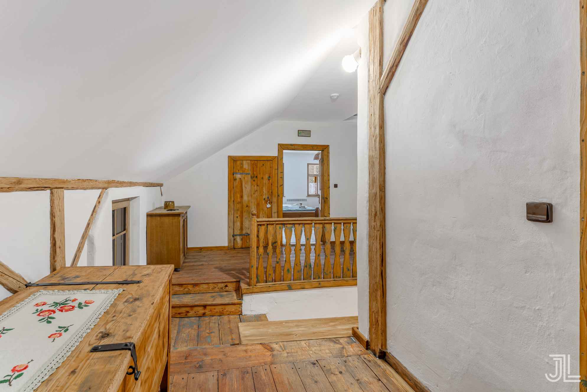 Střed podkroví funguje jako spojovací uzel, který propojuje obě nocležní křídla. Vše přehledné a snadno orientovatelné díky otevřenému zábradlí a oknu do dvora. Dřevo, truhla a přiznané trámy udržují rustikální atmosféru a prostor působí jako samozřejmý střed celého patra.
