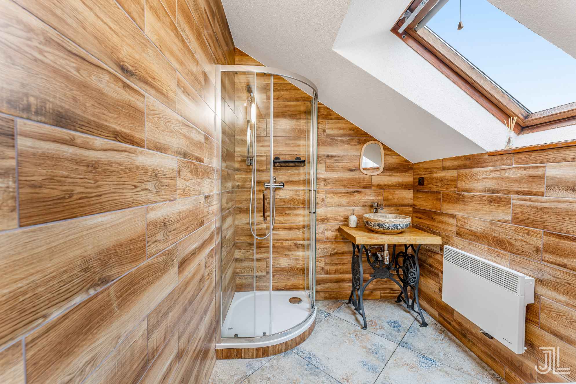 Spodní koupelna nabízí prostorný sprchový kout, značková umyvadla od SIKO a dvě samostatné toalety hned vedle sebe, takže se větší skupina ráno nepřetlačuje. Kromě této koupelny je v přízemí ještě jedna další… samostatná, se sprchovým koutem a toaletou v oddělené místnosti. Tato část je přístupná přes vlastní dveře, takže funguje jako plnohodnotné zázemí pro další pokoj. V patře je pak další koupelna se sprchou, umyvadlem a střešním oknem. Takže celkem máte k dispozici tři koupelny.