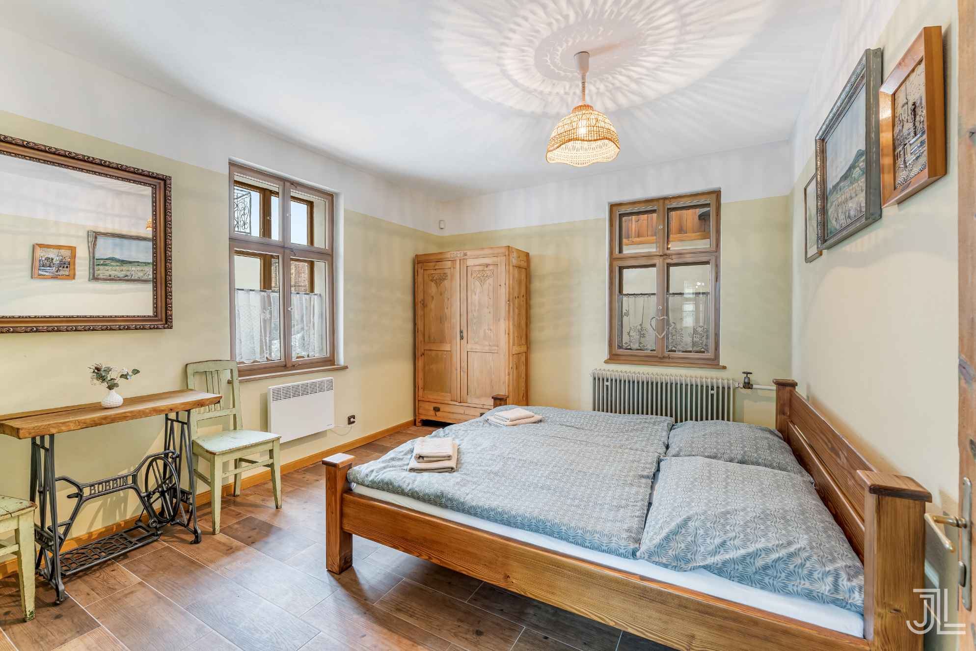 Na protější straně patra najdete druhý velký pokoj s dvojicí dvoulůžkových postelí. Masivní skříň, staré dřevěné podlahy a obrazy na stěnách jen doplňují celou atmosféru patra, které drží jednotný styl a příjemně působí na každého hosta.