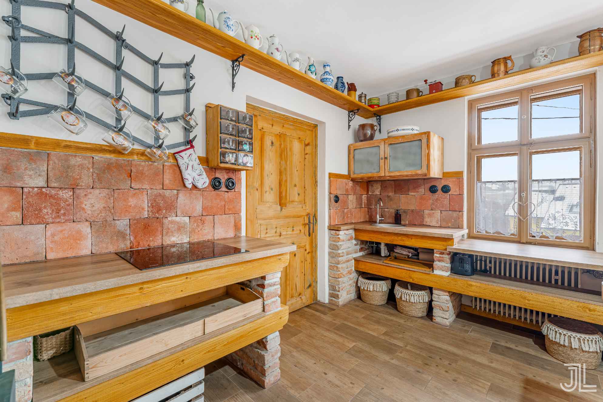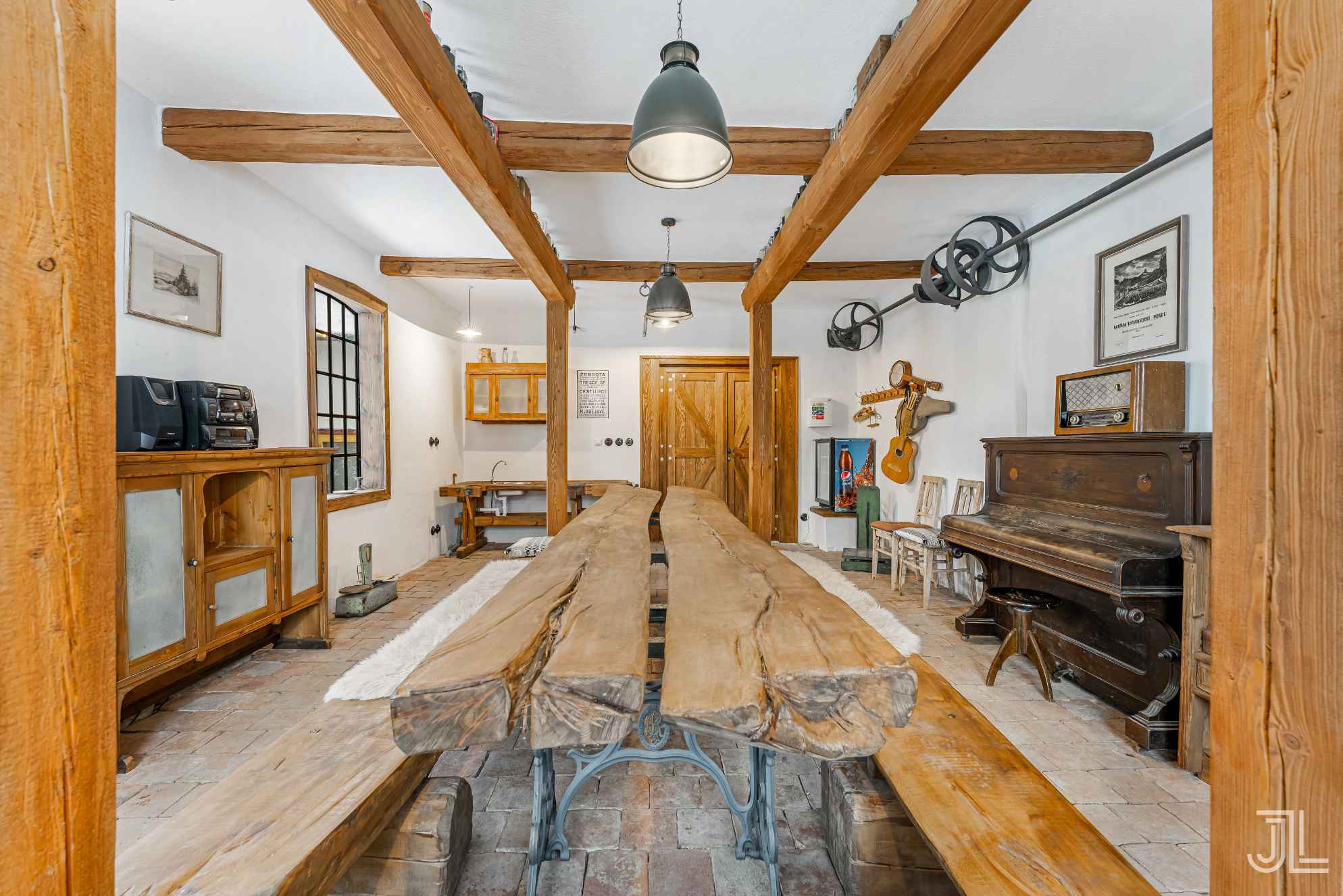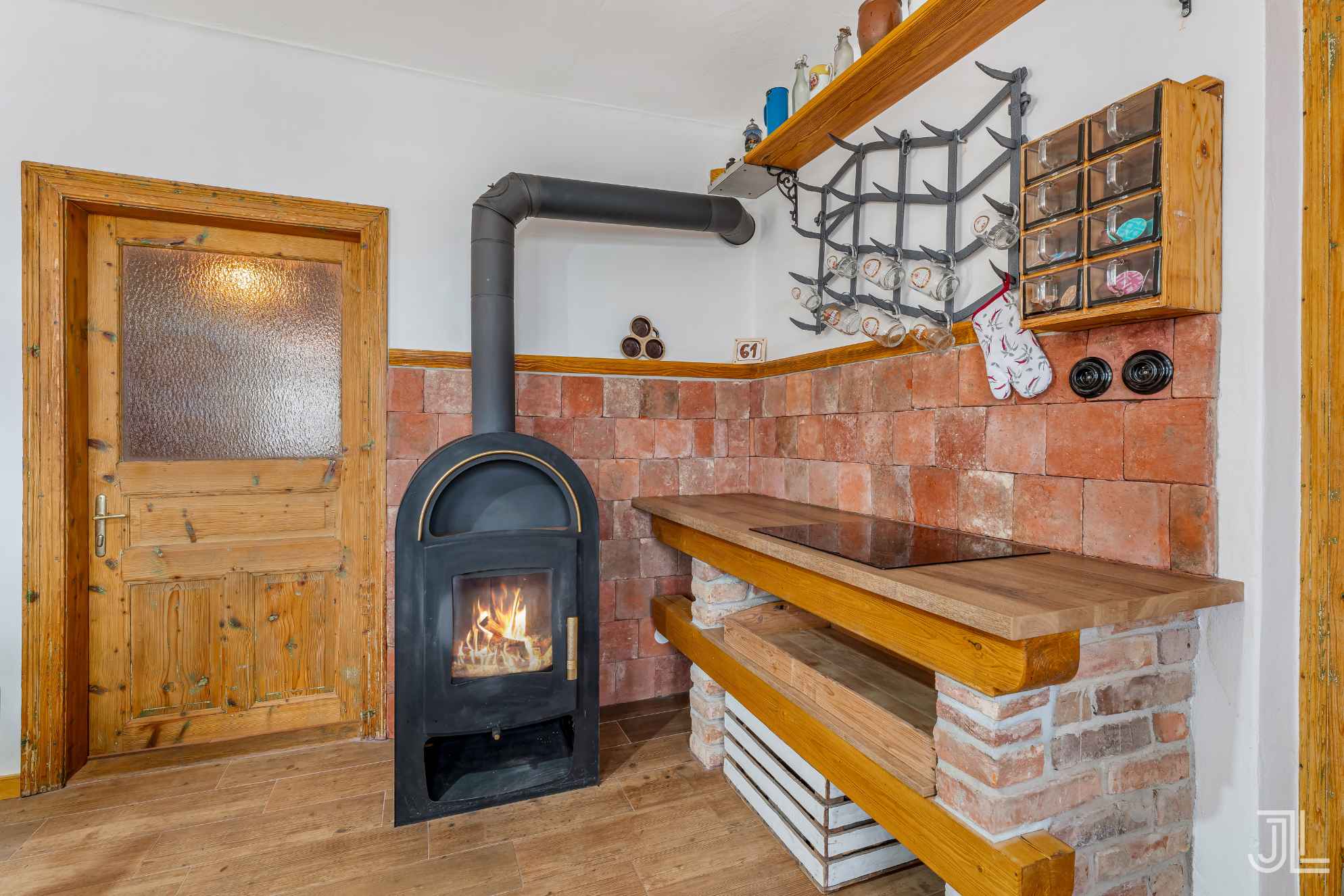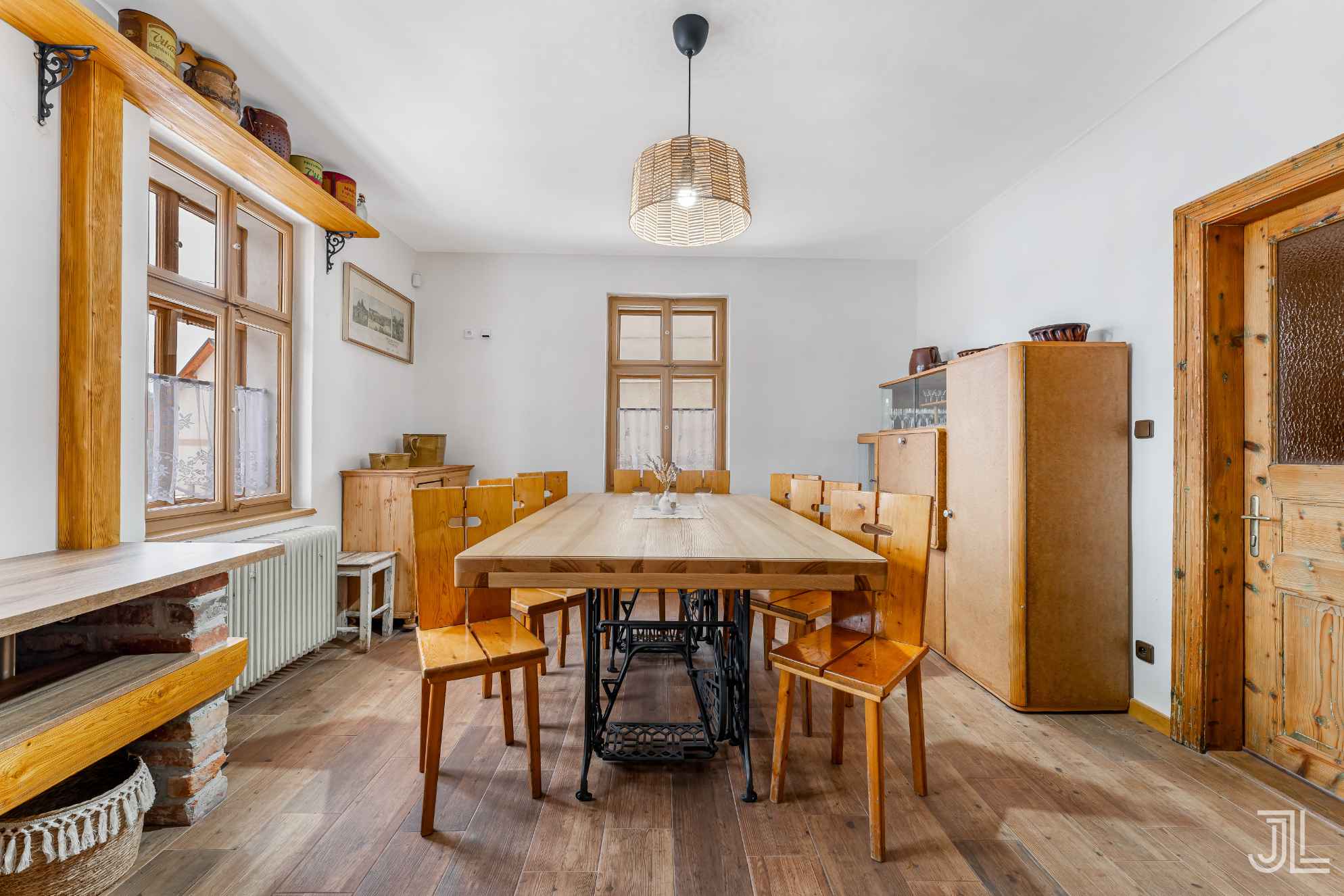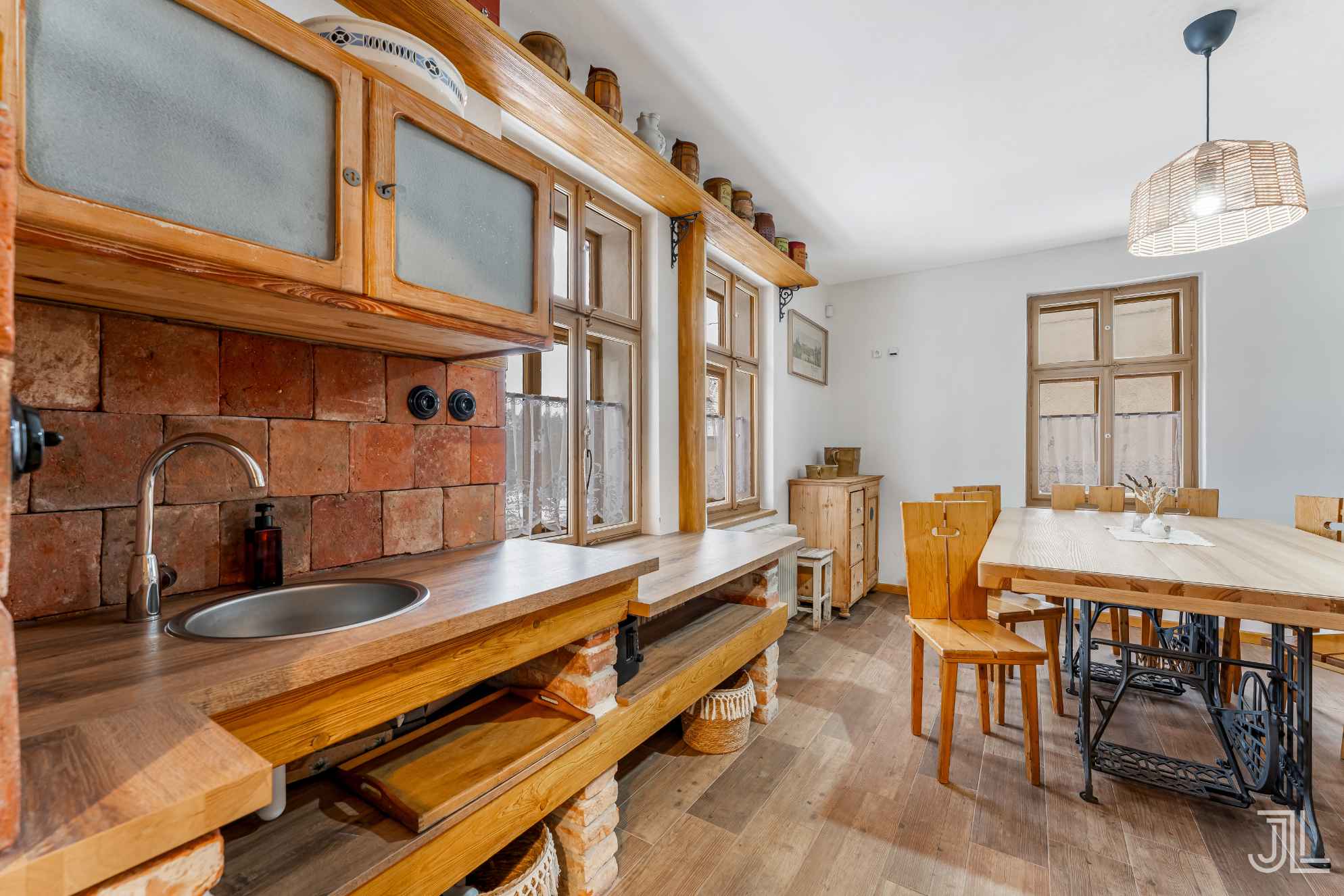 Tahle kuchyně je srdcem přízemí. Všechno je dělané z masivu, na míru a s respektem k historii domu. Cihlové obklady, šicí stroje místo podnoží a kamna, která vytvářejí atmosféru, kvůli které sem lidé jezdí v létě i v zimě. Místo, kde to voní dřevem, teplem a starými příběhy.