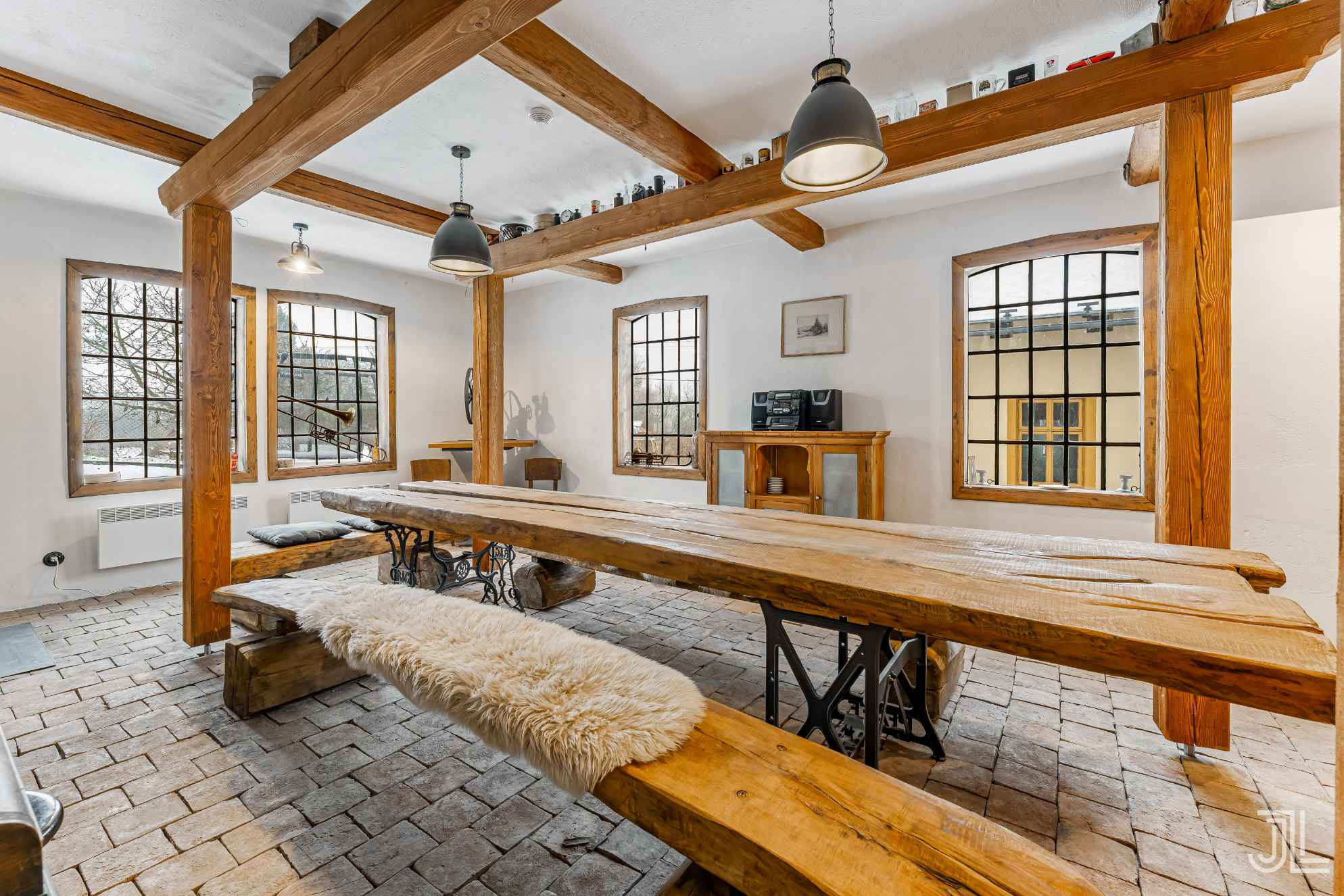 Velká jídelna, která pojme celou partu.. rodinu, dvě rodiny nebo hosty z Bookingu. Dlouhý stůl, dost prostoru a rustikální styl, který má svůj příběh. To není chalupa na víkend, tohle je místo, kde se sedí dlouho do noci a hosté se sem rádi vrací.