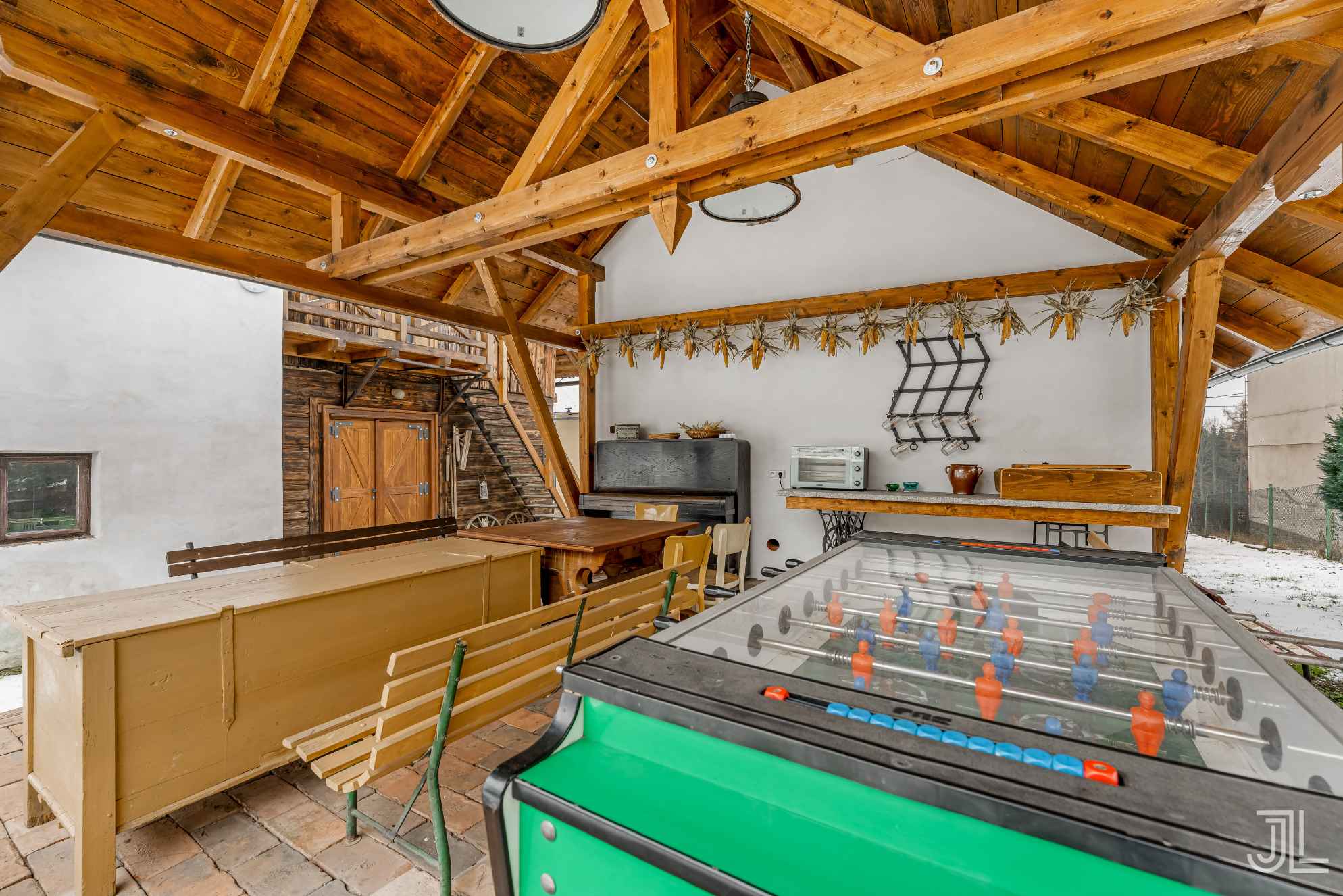 Hned vedle kalírny je kryté venkovní posezení s vlastním fotbálkem, pianem a stolním zázemím… místo, kde tráví čas všichni. A nad ním? Rozestavěné podkroví připravené na samostatný byt, ideální pro rodinu, správce nebo další komerční využití.