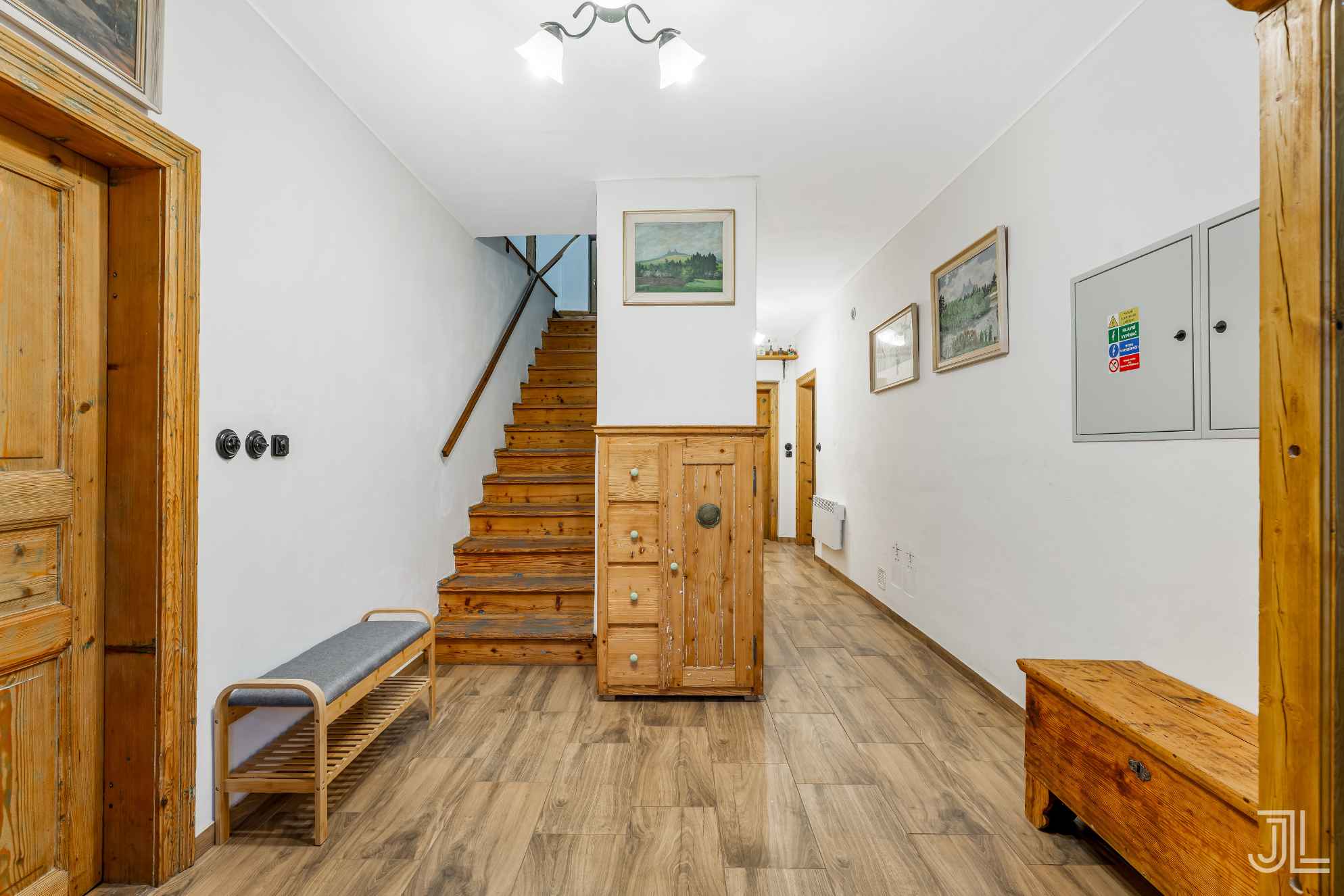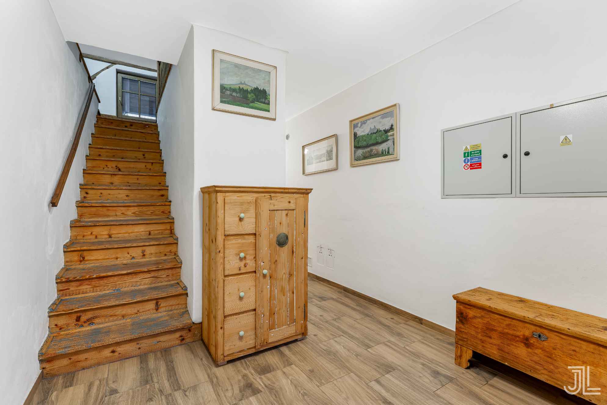 Chodba v přízemí funguje jako jednoduchý rozcestník… z hlavního vstupu jdeš přímo po schodech nahoru do pokojů, nebo pokračuješ dozadu do vinného sklípku a k sociálnímu zázemí.